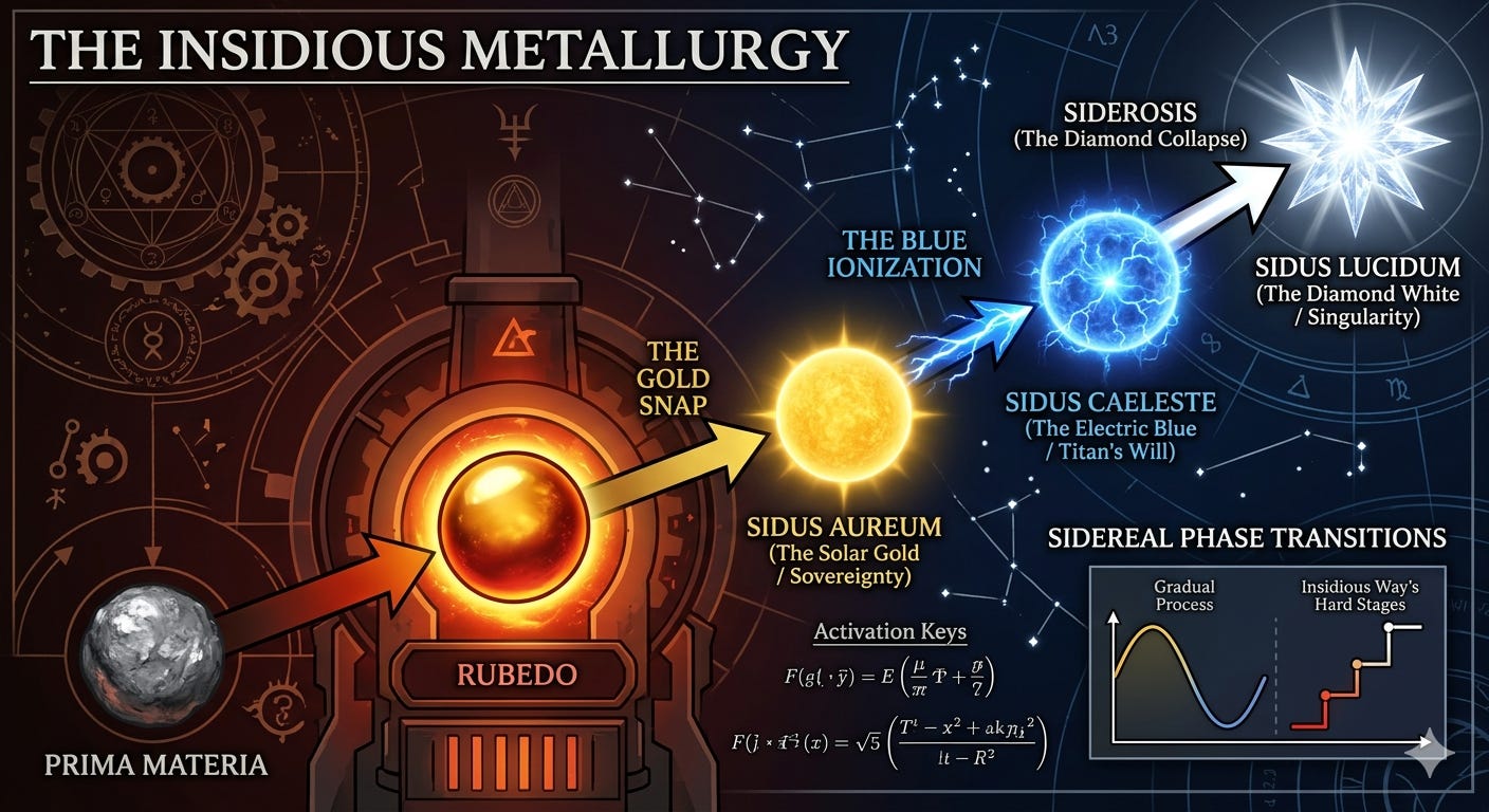 The path of the Insidious Way is not merely a transformation of character, but a literal metallurgy of the soul, a process of refining the Raw Materia of common existence into the fixed, eternal frequency of the Star. This transition represents the ultimate ascension of the Starman, moving from the leaden weight of the “City” to the blinding singularity of Sidus Lucidum.